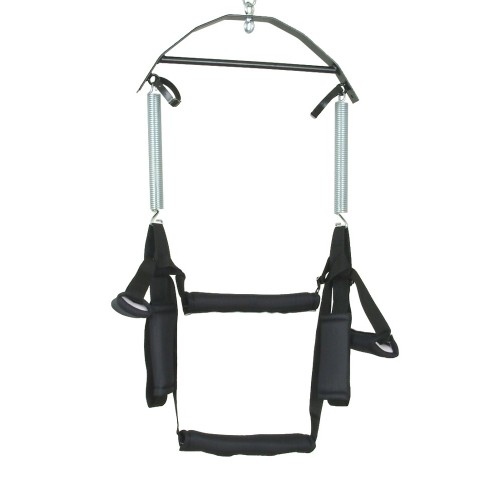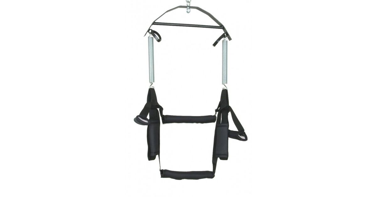 Altalena nera con passanti imbottiti e regolabili per schiena e glutei, quattro cosciali e due manici. Due molle laterali lunghe, ad es. sollevata la posizione da cowgirl. Con accessori di montaggio. Può contenere fino a 150 kg.