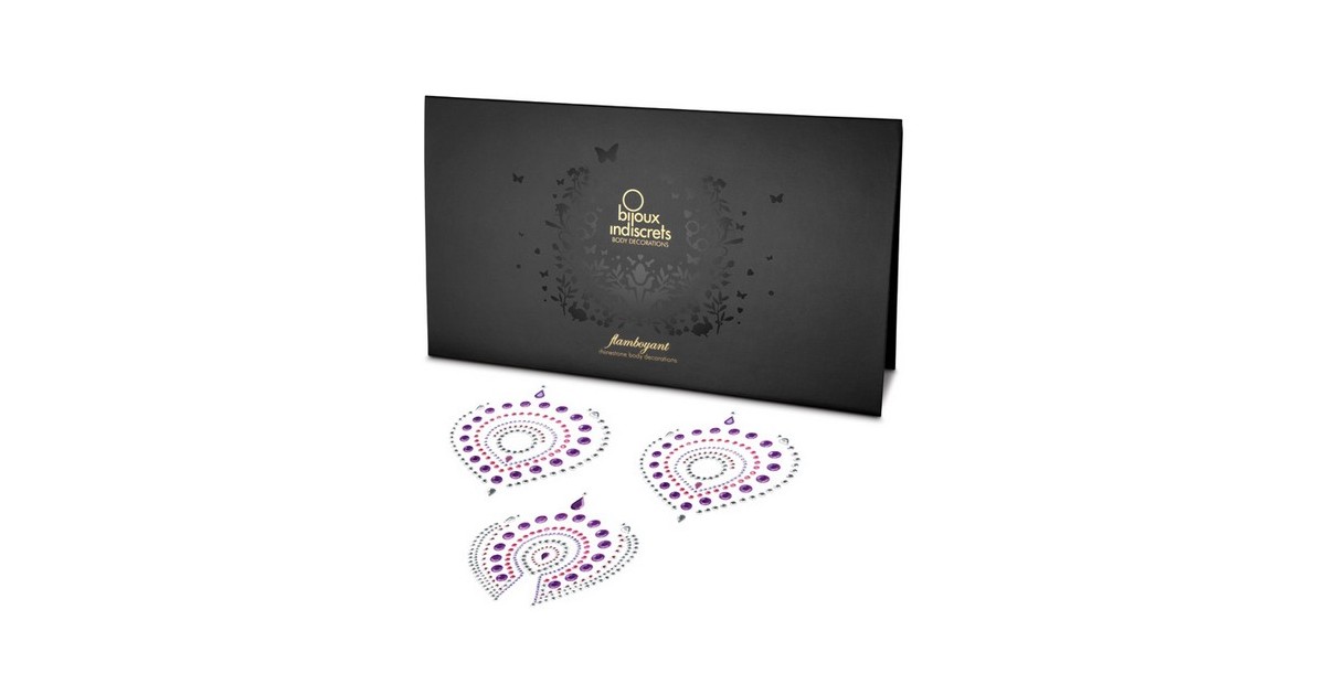 Gioielli autoadesivi per impreziosire ancor di più i vostri seni e la farfallina. Sono realizzati a mano con inserimento di effetti glitter e cristalli Swarovski. Tre pezzi in totale.