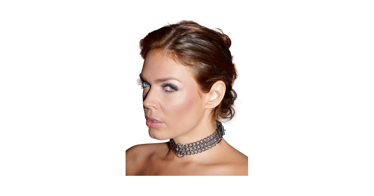 Collana realizzata con cinturini in pelle nera, con chiusura a fibbia regolabile, tre catene davanti alle quali è attaccato un anello di fissazione. Materiale: crosta di cuoio, metallo.