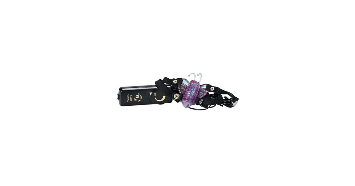 Farfallina su supporto strap on per la stimolazione dell'area vaginale e clitoridea, dotata di telecomando per regolare l'intensità della vibrazione. Utilizza 2 batterie AA, non comprese.
