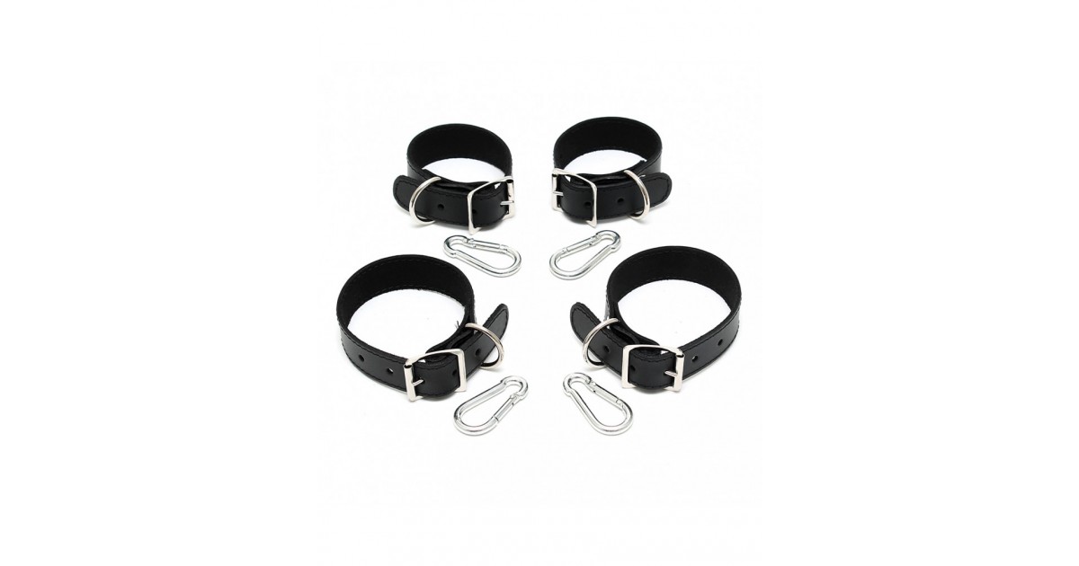 Rimba Bondage Play in vera pelle e cinghie 2,5 cm. Questi cinturini in morbido cuoio hanno anelli a D per il collegamento. Questo set contiene 4 cinturini per polsini in 2 taglie con chiusura con fibbie in metallo e 4 ganci per moschettone in metallo inclusi.