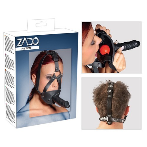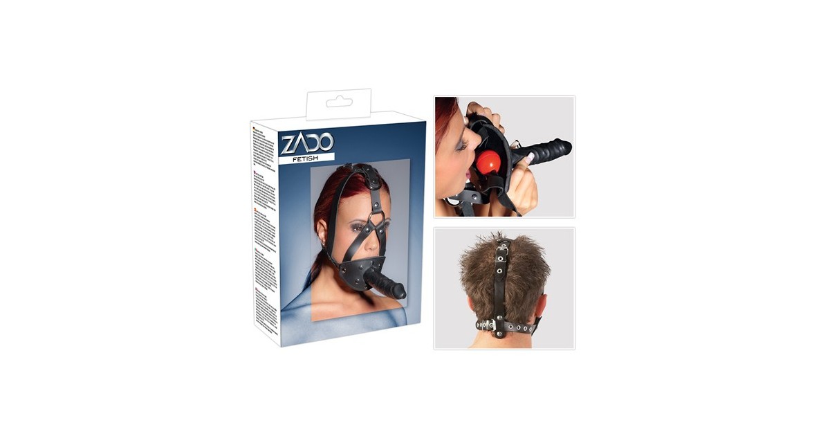 Alla maschera per la testa di pelle crosta nera, regolabile, é fissata internamente una mordaccia di plastica rossa (Ø 3,5 cm) ed esternamente un imponente dildo di lattice (13 cm di lunghezza, Ø 3,5 cm). Prodotto utilizzando lattice di caucciù naturale che può causare allergie