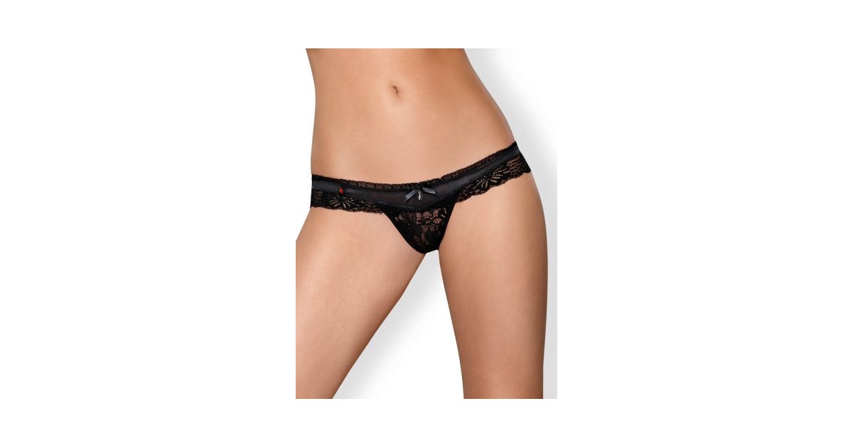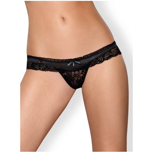 Sexy perizoma realizzato realizzato in morbido pizzo nero dal motivo floreale, con banda elastica in raso decorata da un fiocchetto con gioiello.
